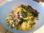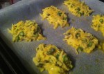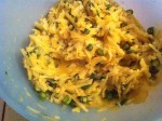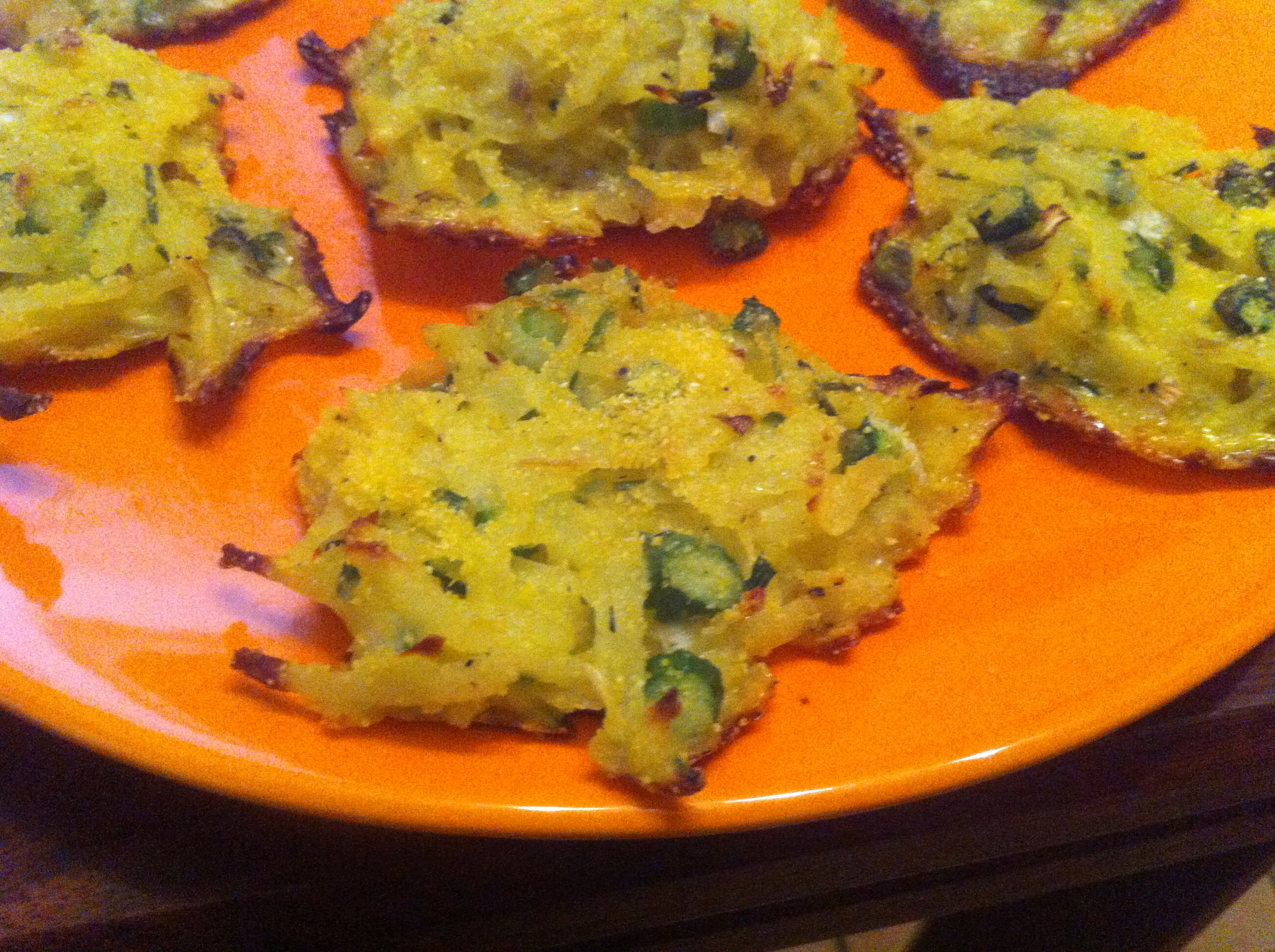 Tagliate a julienne patate e cipollotto, a rondelle gli asparagi, unite erba cipollina e rosmarino sminuzzati, sale, pepe e mezzo cucchiaino di curcuma, unite le due uova e mescolate. Coprite con un foglio di carta forno una teglia, ungete leggermente con un filo di olio evo e formate tanti mucchietti con il composto, spolverizzate con la farina di mais e infornate per circa 20′.