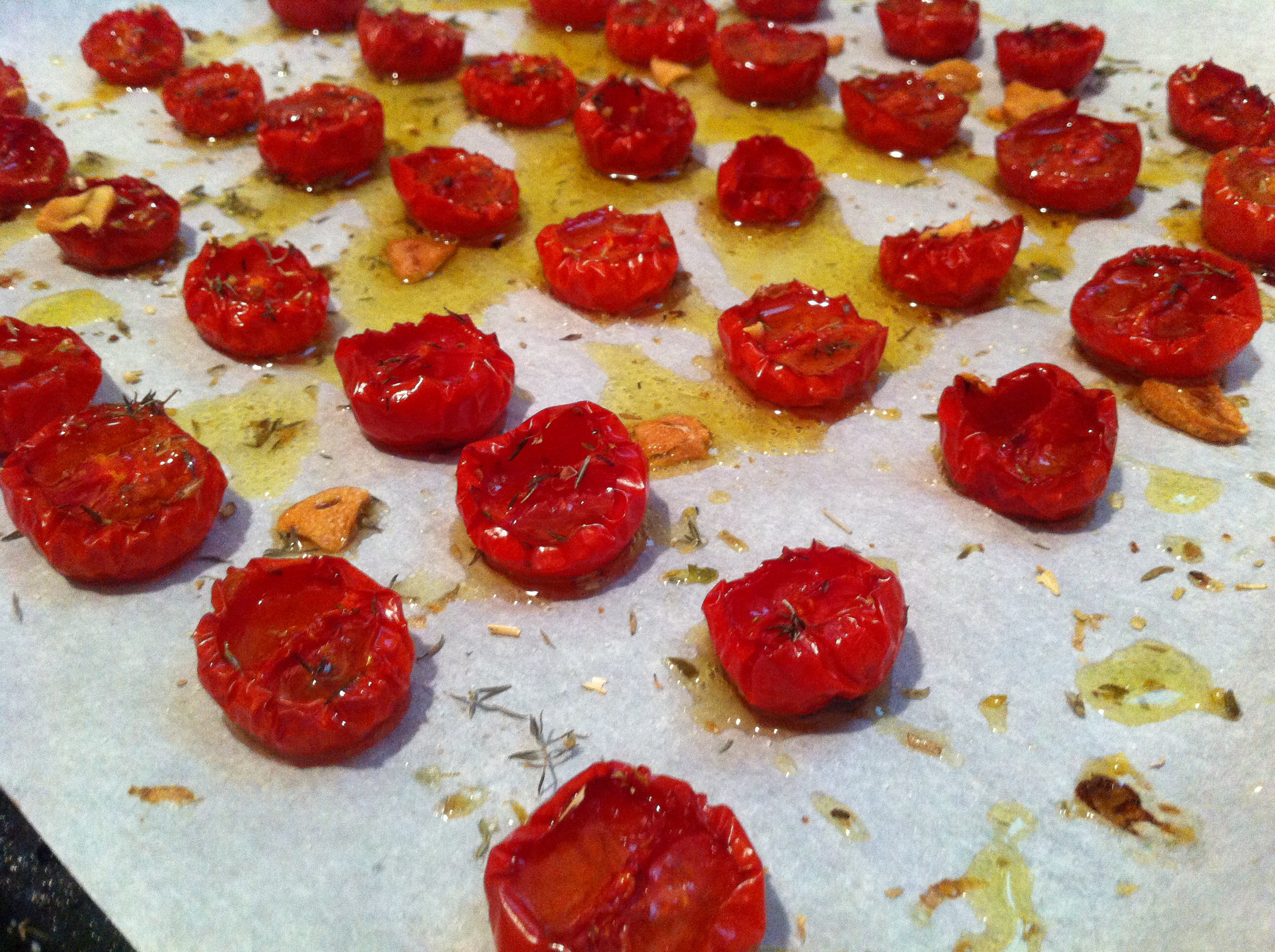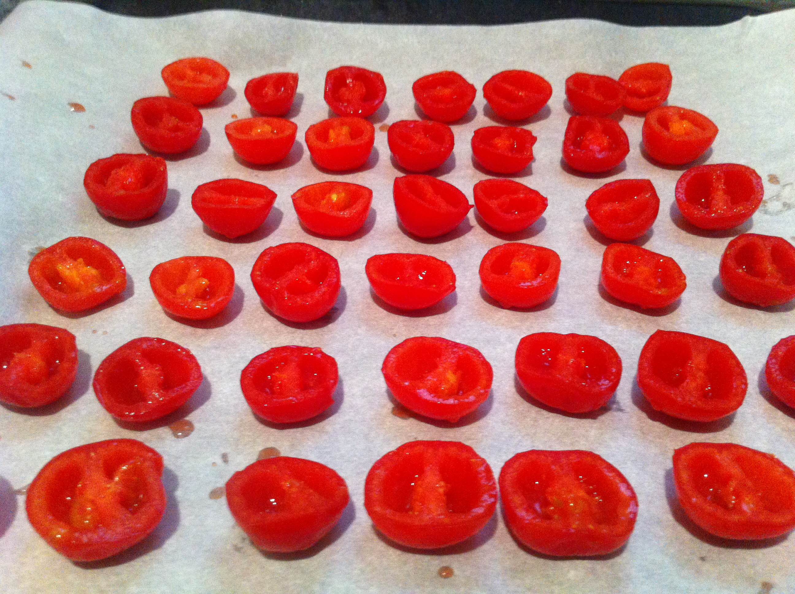 Metteteli in forno per circa 2 1/2 ore (aumentate il tempo di cottura se utilizzate pomodori più grandi che avrete però pelato e diviso in spicchi).