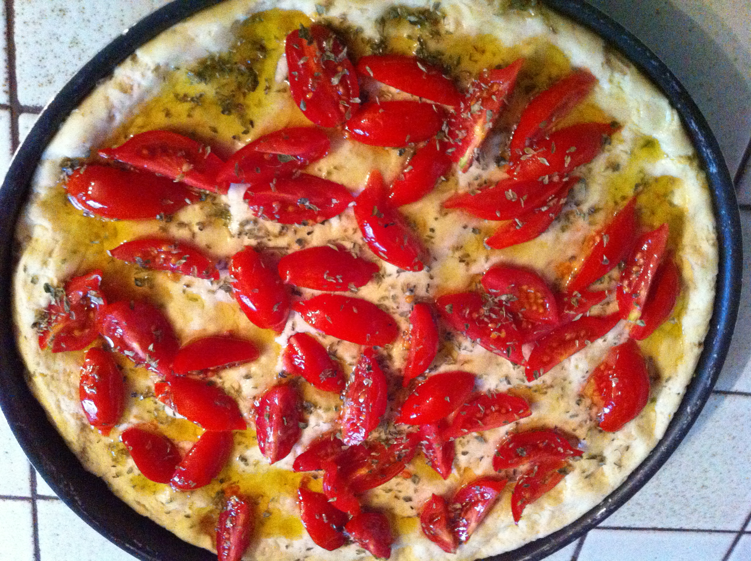 Tagliate i pomodorini a spicchi (in quattro parti), salateli e ricoprite l’impasto. Condite con abbondate olio e origano.