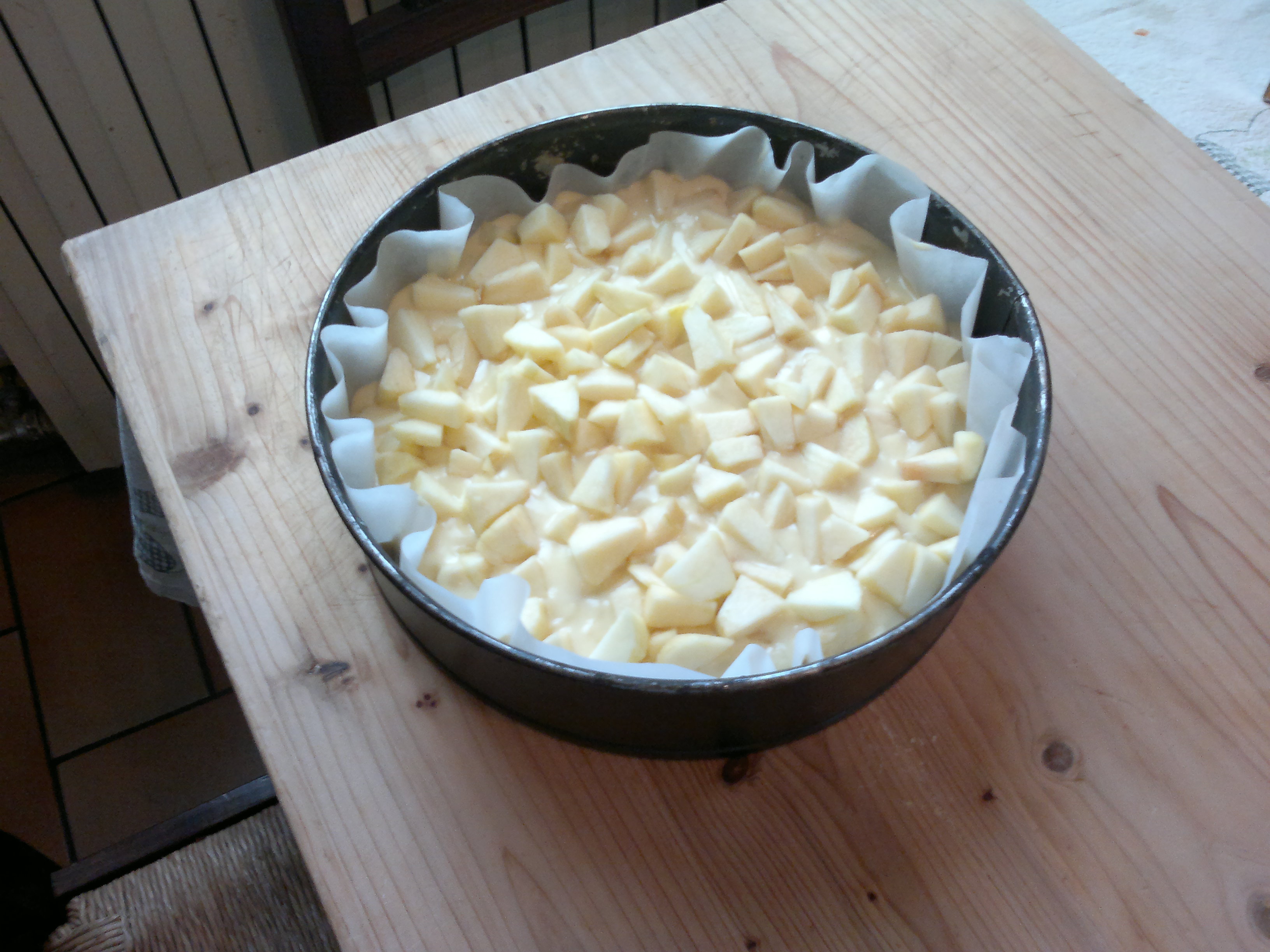 Versa metà dell’impasto in una tortiera ricoperta di carta da forno o imburrata (del diametro di 26 cm), fai uno strato di mele, ricopri con il restante impasto e termina con un altro strato di mele e una spolverata di cannella.